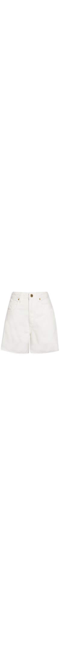 A bermuda branca é confeccionada em sarja sem elasticidade. A peça solta ao corpo, possui cintura alta, cós com passantes aplicados, five pockets* com rebites aplicados, tag da marca aplicada na parte posterior do cós, tag metalizada aplicada no bolso posterior, acabamento por corte a fio e fechamento frontal por zíper e botão.
