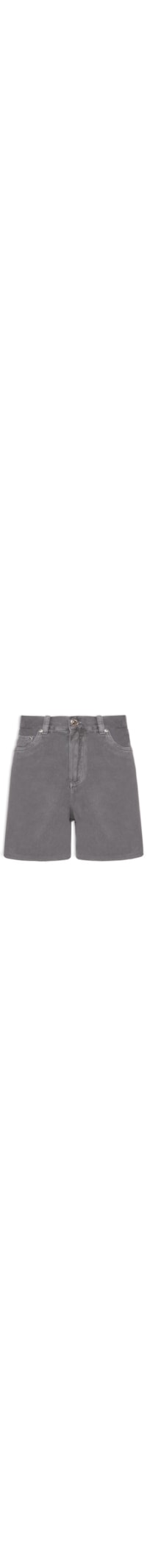 A bermuda cinza é confeccionada em sarja com lavagem jeans sem elasticidade. A peça solta ao corpo possui cintura alta, cós com passantes e tag da marca aplicada na parte posterior, bolsos frontais de modelo faca, bolsos posteriores com tag da marca metalizada, pregas frontais, efeito estonado, comprimento curto e fechamento frontal em zíper e botão de pressão.