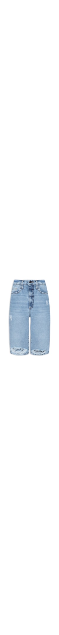 A bermuda azul é confeccionada em sarja com lavagem jeans sem elasticidade. A peça solta no corpo possui cintura alta, cós com passantes aplicados, five pockets*, rebites metálicos aplicados nos bolsos frontais, logo da marca metalizado no bolso posterior, detalhes destroyed** e de puídos e fechamento frontal por zíper e botão.