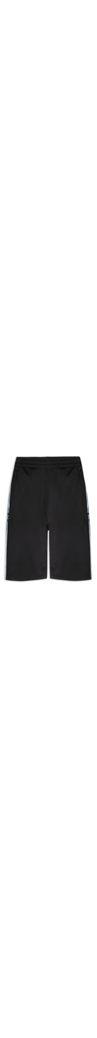A bermuda preta é confeccionada por tecido leve sem elasticidade. A peça possui cintura média, elástico embutido no cós, recorte na lateral em cor contrastante, listras nas laterais em cor contrastante, nome da marca aplicado na lateral, bolsos frontais com fechamento por zíper, botões de pressão na lateral posterior e comprimento curto.