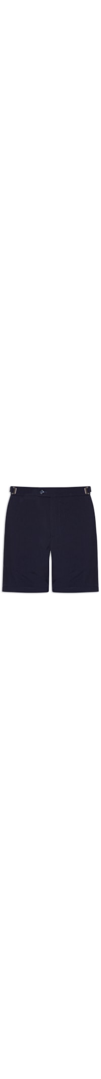 A bermuda azul é confeccionada em tecido leve com baixa elasticidade. A peça possui cós com passantes e reguladores laterais com fivela metálica, bolsos frontais estilo faca, bolsos posteriores embutidos, comprimento acima do joelho, caimento reto e fechamento frontal por zíper e botão.