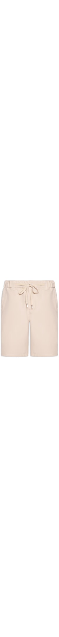 A bermuda bege é confeccionada em tecido leve com baixa elasticidade. A peça solta ao corpo possui cintura média, cós com elástico e cordão embutido, bolsos frontais modelo faca, bolsos posteriores embutidos com fechamento por botão e fechamento frontal por botão e zíper.