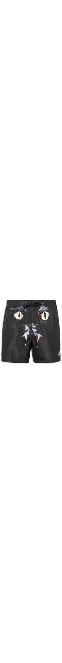 A bermuda preta é confeccionada por cintura média é confeccionada por tecido leve sem elasticidade. A peça solta ao corpo possui cintura média, elástico e cordão embutido no cós, bolsos frontais no modelo faca, estampa frontal figurativa de gato em cor contrastante, nome da marca aplicada na barra frontal em cor contrastante, pequenas fendas laterais, bolso posterior, fechamento por amarração e comprimento curto.