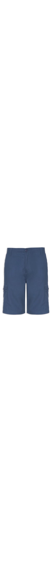 A bermuda azul é confeccionada em sarja sem elasticidade. A peça solta ao corpo possui cintura média, cós com passantes para cinto aplicados, dois bolsos frontais, dois bolsos posteriores, e dois bolsos nas laterais na parte inferior com aba sobreposta e fechamento por botão, detalhes pespontados, comprimento curto, e fechamento frontal por zíper e botão.