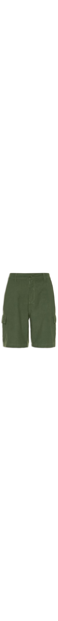 A bermuda verde é confeccionada em tecido leve com toque de linho. A peça possui cintura média, cós com passantes aplicados, bolsos frontais modelo faca, bolsos posteriores embutidos, bolsos laterais com fechamento por aba sobreposta, shape solto e fechamento frontal por botão e zíper.