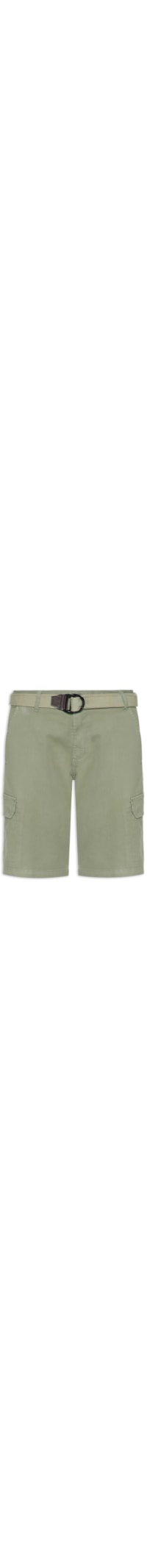 A bermuda verde é confeccionada em sarja com baixa elasticidade. A peça solta ao corpo de modelo cargo possui cintura média, cós com passantes para cinto aplicados, dois bolsos frontais, dois bolsos posteriores com fechamento por botões, dois bolsos laterais na altura do joelho com fechamento por botões, logo da marca bordado na parte posterior, comprimento curto, e fechamento frontal por botão e zíper. Acompanha cinto e gorgurão de espessura média, com ponteiras em cor contrastante aplicadas e fivela arredondada com nome da marca timbrado para uso opcional.
