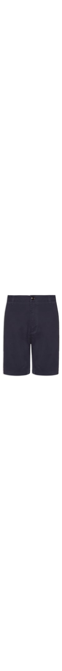 A bermuda azul é confeccionada em sarja com baixa elasticidade. A peça solta ao corpo possui cintura média, cós com passantes aplicados, bolsos frontais modelo faca, bolsos posteriores embutidos com fechamento por botão, comprimento curto e fechamento frontal por botão e zíper.