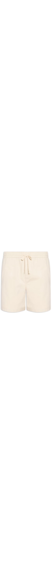 A bermuda bege é confeccionada em sarja com baixa elasticidade. A peça solta ao corpo possui cintura média, cós elástico com cordão embutido para ajuste frontal, bolsos frontais modelo faca, bolsos posteriores embutidos, comprimento curto e fechamento frontal por botão e zíper.