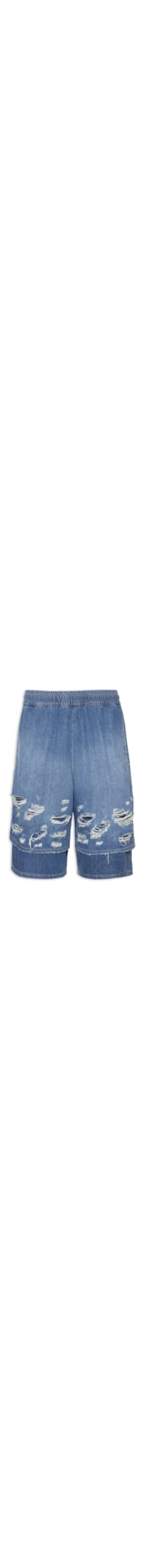 a bermuda Azul é Confeccionada Em sarja Com Lavagem Jeans E Baixa Elasticidade. A Peça Solta Ao Corpo Possui Cintura Média, Cós Com Elástico E Cordão Embutido Na Parte Interna Para Ajuste, Bolsos Frontais E Posteriores Embutidos, Short Sobreposto Com Detalhes Destroyeds*, Efeito Estonado E Comprimento Curto.