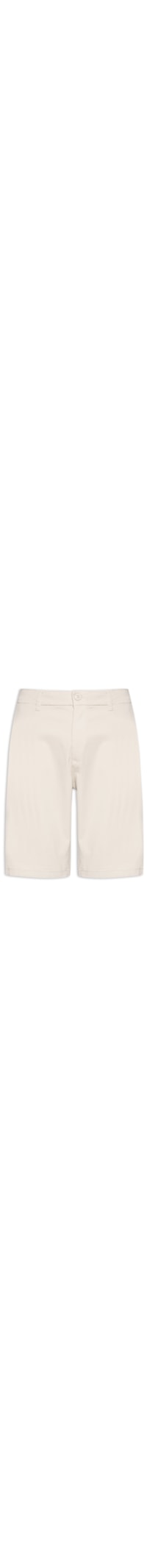 A bermuda bege é confeccionada em sarja com média elasticidade. A peça solta ao corpo possui cintura média, cós com passantes, pences posteriores, bolsos posteriores embutidos com fechamento por botão, bolsos frontais modelo faca e fechamento frontal por botão e zíper.