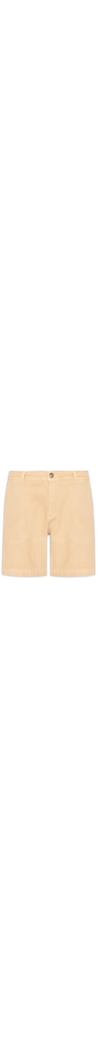 A bermuda bege é confeccionada em tecido leve de algodão sem elasticidade. A peça possui cintura média, cós com passantes aplicados, bolsos frontais modelo faca, bolsos posteriores embutidos com fecho por botão, pences posteriores, tag da marca aplicada na parte posterior e fechamento frontal por botão e zíper.
