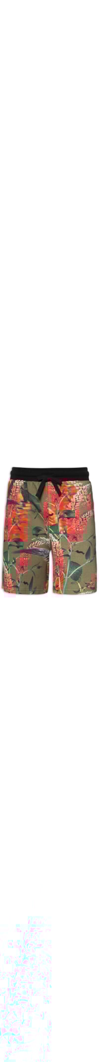 A bermuda verde é confeccionada em moletom. A peça possui cintura média, cós em cor contrastante com cordão embutido para ajuste, bolso posterior, bolsos frontais de modelo faca, estampa floral em cores contrastantes, comprimento curto, shape solto, caimento reto e acabamento pespontado.