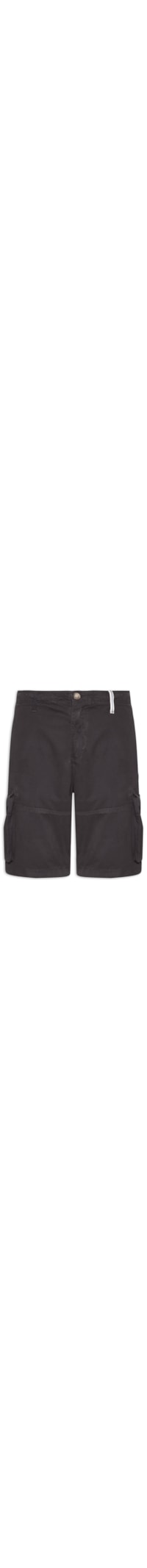 A bermuda cinza é confeccionada em sarja sem elasticidade. A peça solta ao corpo, possui cintura média, cós com passantes aplicados e cordão embutido para ajuste, faixa de gorgurão com detalhe de listra em cor contrastante aplicada no passante frontal, bolsos frontais, posteriores com aba sobreposta e laterais com fechamento por aba sobreposta e botão, logo da marca bordado em cor contrastante na parte posterior, comprimento médio e fechamento frontal por zíper e botão.
