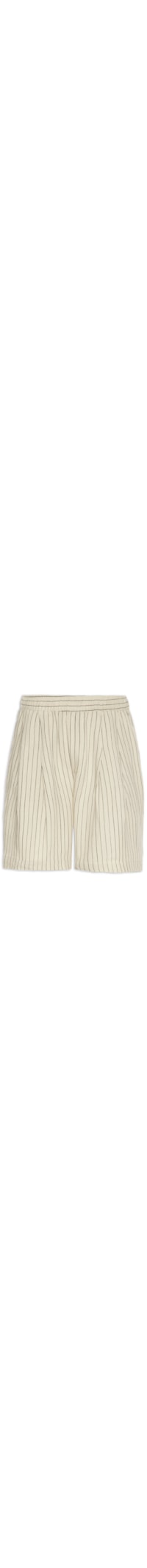 A bermuda bege é confeccionada em tecido leve com toque de linho sem elasticidade. A peça solta no corpo possui cintura média, cós com elástico e cordão interno embutidos para ajuste, bolsos frontais modelo faca com rebite metálico aplicado, bolso posterior, detalhe de pregas frontais e padronagem de listras em cor contrastante.