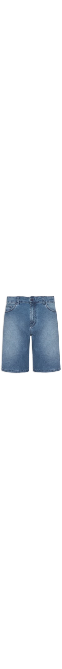 A bermuda azul é confeccionada em sarja com lavagem jeans com baixa elasticidade. A peça solta ao corpo possui cintura média, cós elástico com passantes aplicados, five pockets*, recortes posteriores, tag da marca aplicada na parte posterior, efeito estonado e fechamento frontal por botão e zíper.