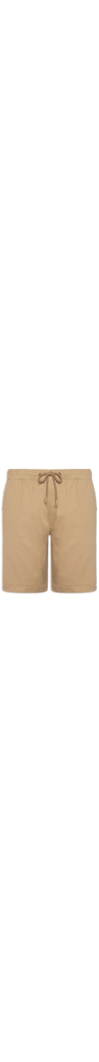 A bermuda bege é confeccionada em sarja com baixa elasticidade. A peça solta ao corpo possui cintura média, cós elástico com cordão embutido para ajuste frontal, bolsos frontais modelo faca, bolsos posteriores embutidos e comprimento curto.