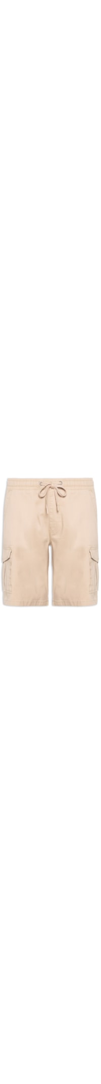 A bermuda bege é confeccionada em sarja com baixa elasticidade. A peça solta ao corpo possui cós com elástico e cordão para amarração frontal embutidos, recortes frontais e posteriores, bolsos frontais modelo faca, bolsos posteriores embutidos e bolsos laterais com vista sobreposta.