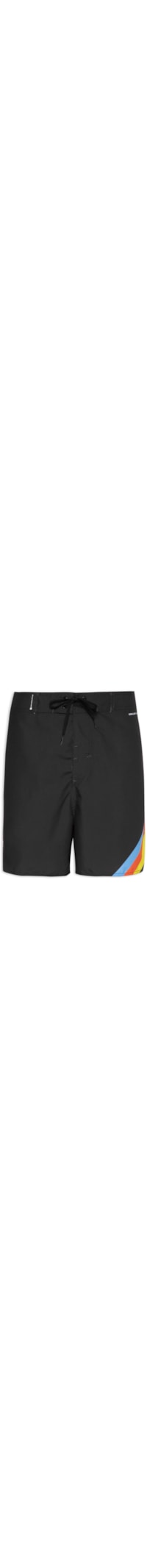 A bermuda preta é confeccionada em tactel. A peça possui cintura média, cós com recortes frontais e tag emborrachada da marca aplicada, bolsos frontais, bolso posterior com fechamento por velcro e puxador emborrachado com logo da marca em relevo, ilhós e tag da marca aplicados na parte posterior, faixas em cores contrastantes aplicadas na parte frontal, nome da marca aplicado em cor contrastante na altura da barra na parte frontal, comprimento curto, shape solto, caimento reto, acabamento pespontado e fechamento frontal por cordão e velcro.