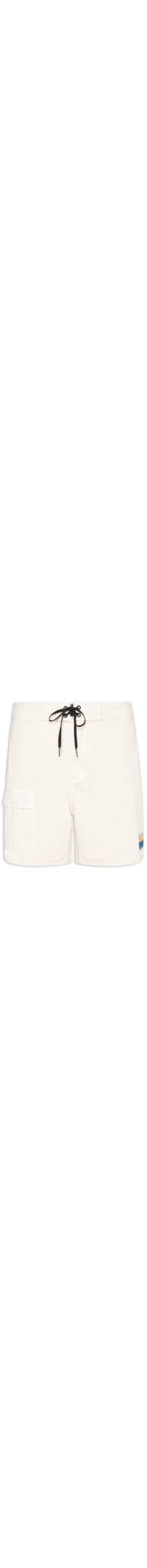 A bermuda off white é confeccionada em tecido leve sem elasticidade. A peça possui cintura média, cós reto com ilhóses, bolso posterior embutido, bolso cargo embutido, comprimento curto, tag da marca aplicada na altura da barra e fechamento frontal por amarração.