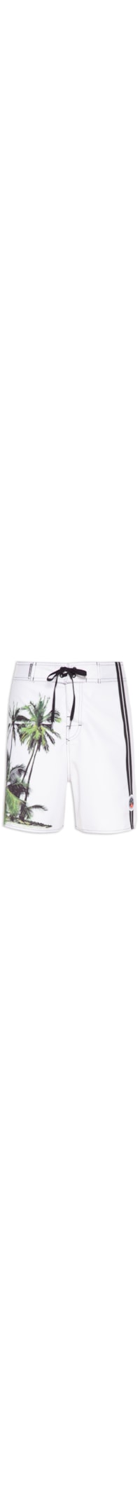A bermuda off white é confeccionada em tactel com superfície levemente texturizada sem elasticidade. A peça solta ao corpo possui cintura média, cós com cordão aplicado na parte frontal para ajuste e tag emborrachada da marca aplicada, pences posteriores, bolso posterior com fechamento por velcro com puxador emborrachado e ilhós aplicado, parte frontal com aplicação de listras em viés de cor contrastante e tag da marca bordada na altura da barra, estampa figurativa de coqueiros em cores contrastantes, comprimento curto e fechamento frontal por velcro.
