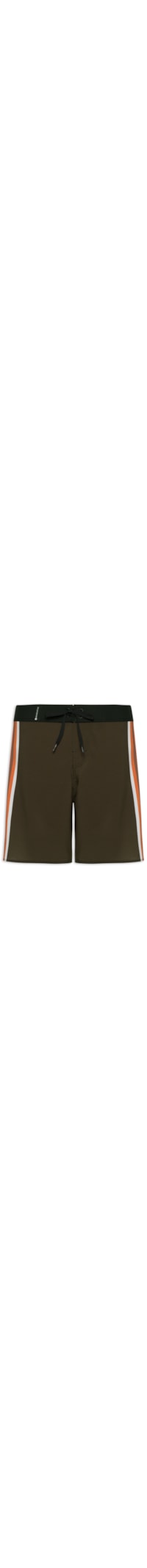 A bermuda marrom é confeccionada em tecido leve com baixa elasticidade. A peça solta ao corpo possui cintura média, cós com recortes sobrepostos com aplicação de ilhoses e cordão para ajuste frontal, bolso posterior embutido com aplicação de ilhós, tags da marca e fechamento por velcro, listras laterais em cores contrastantes, logo da marca aplicado em cor contrastante na parte frontal, comprimento curto e fechamento frontal por amarração e velcro.