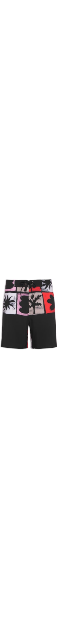 A bermuda preta é confeccionada em tactel de baixa elasticidade. A peça solta ao corpo, possui cintura média, cós com tag emborrachada da marca aplicada e ilhóses metálicos com cordão para regulagem frontal, estampa figurativa de tridente na parte frontal da barra, bolso posterior com tag da marca aplicada, puxador emborrachado e fechamento por velcro, mix de estampas figurativas em cores contrastantes e fechamento frontal por velcro.