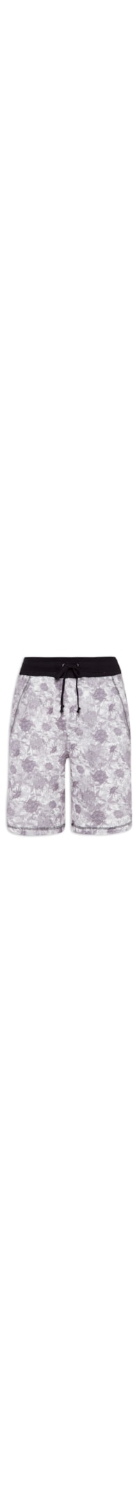A bermuda cinza é confeccionada em moletom. A peça possui cintura média, cós elástico em cor contrastante com cordão embutido para ajustes, bolsos frontais de modelo faca, bolsos posteriores, estampa floral em cor contrastante, caimento reto e acabamento pespontado.