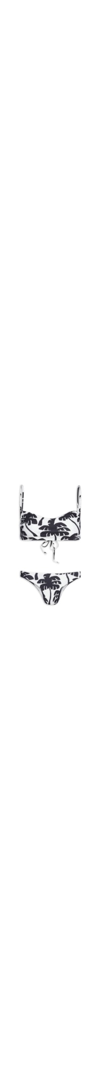 O biquíni preto é confeccionado em malha com alta elasticidade. O top possui decote coração, alças finas, sem bojo, estampa figurativa de coqueiros, dupla face com estampa listrada na cor off white, sem bojo, laterais finas e fechamento posterior por amarração. A calcinha de modelo asa delta possui laterais médias, estampa figurativa de coqueiros e dupla face com estampa listrada na cor off white.