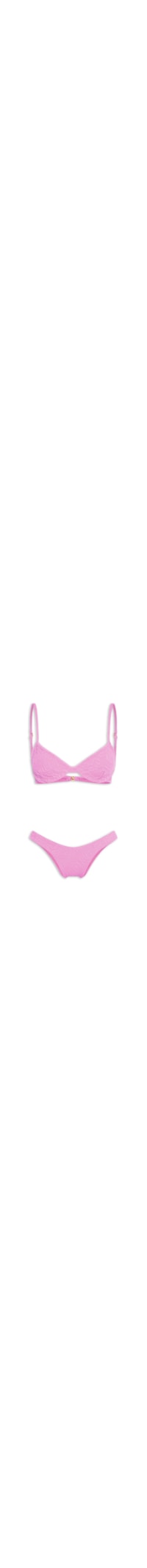 O biquíni rosa é confeccionado em malha de poliamida texturizada com alta elasticidade. O top modelo meia taça possui alças reguláveis, laterais médias, bojo, pences frontais, escrita em alto-relevo, forro e fechamento posterior por encaixe. A calcinha modelo asa delta possui laterais médias, escrita em alto-relevo e forro.