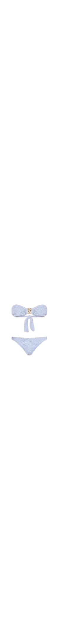O biquíni azul é confeccionado em malha poliamida com média elasticidade. O top justo ao busto possui decote reto, modelo bandeau, aplicação frontal de aviamento metálico orgânico, superfície com textura em relevo com fio metalizado, acabamento franzido nas extremidades e fechamento posterior por amarração. A calcinha modelo asa delta com laterais médias, textura em relevo com fio metalizado, acabamento embutido, forro interno e sem fechamento.