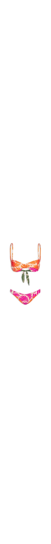 O biquíni rosa é confeccionado em malha de poliamida com alta elasticidade. O top justo ao corpo de modelo torcido possui decote coração, alças finas com regulagem, estampa em cores contrastantes, elástico embutido nas laterais e fechamento posterior por amarração por cordões com miçangas aplicadas. A calcinha de modelo asa delta dupla face possui laterais médias, estampa em cores contrastantes e forro. A outra face possui estampa floral em cores contrastantes.