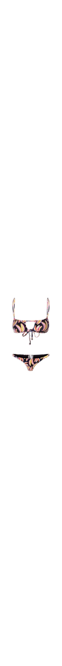 O biquíni preto é confeccionado em malha cirrê de média elasticidade. O top possui decote reto, alças finas reguláveis embutidas na parte frontal, estampa figurativa de bananas em tons contrastantes, forro, bojo removível e fechamento posterior em tiras para amarração. A calcinha de modelo tanga possui cintura baixa, laterais finas com elástico embutido, parte posterior com franzido para efeito push up, estampa figurativa de bananas em tons contrastantes, forro e acabamento elástico.
