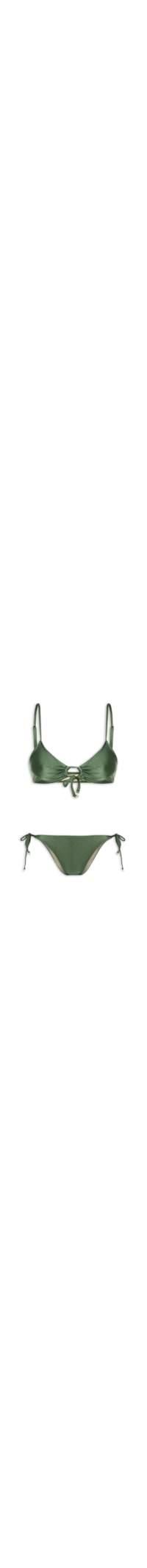 O biquíni verde é confeccionado em malha de poliamida com alta elasticidade e leve brilho. O top possui decote V, alças finas com regulagem, recorte frontal com amarração central, proporcionando ajuste e efeito franzido ao busto. A calcinha possui modelagem tanga, laterais finas, forro e fechamento lateral por amarração.