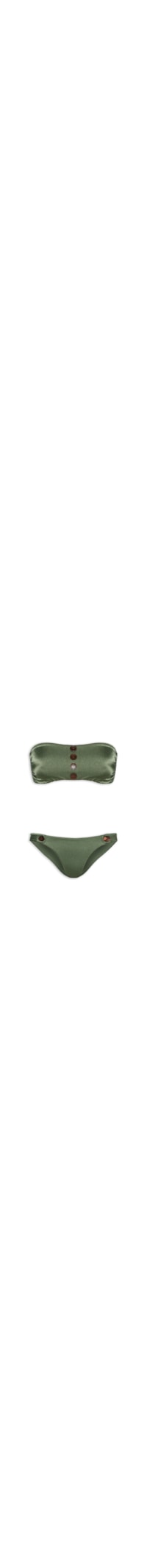 O biquíni verde é confeccionado em malha de poliamida alta elasticidade. O top de modelo tomara que caia possui decote reto, forro, fechamento posterior por encaixe de metal, aros de sustentação nas laterais e detalhe de botões na parte frontal. A calcinha de modelo tanga possui cintura média, forro, laterais médias e detalhe de botões parte frontal.