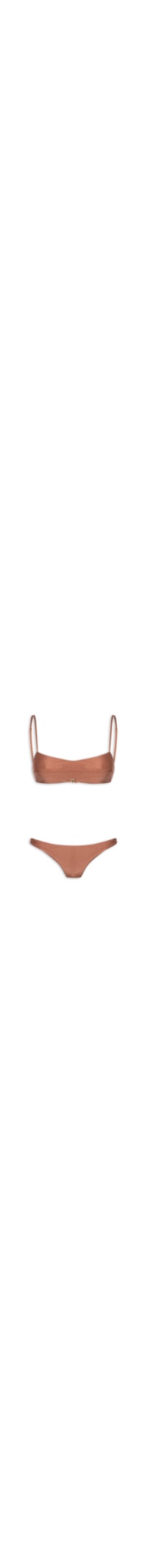 O biquíni marrom é confeccionado em malha cirrê com alta elasticidade. O top possui decote reto, alças finas reguláveis, recorte frontal, tecido duplo, sem bojo e fechamento posterior por aviamentos metálicos para encaixe. A calcinha possui cintura baixa, laterais, médias e tecido duplo.