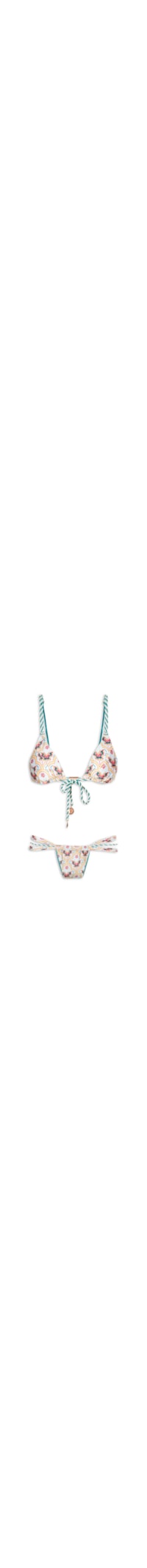 O biquíni azul é confeccionado por malha de poliamida com alta elasticidade. O top justo ao corpo de modelo cortininha possui decote v, alças finas com efeito torcido e ajuste, aplicação metalizada aplicada na tira inferior, padrongame figurativa de borboleta, bojo embutido, forro e fechamento posterior por amarração. A calcinha possui alças laterais médias, padronagem figurativa de borboleta, forro e cavas inferiores.
