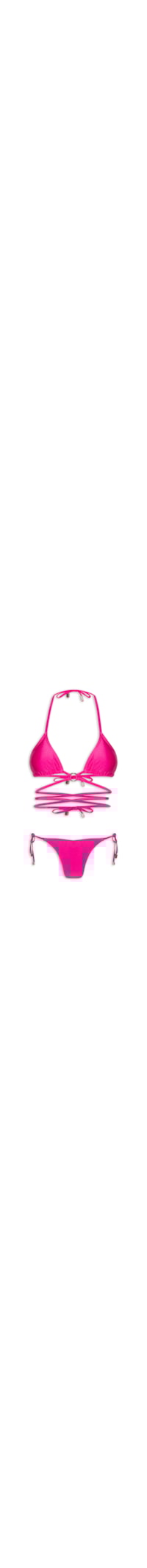 O biquíni rosa é confeccionado em malha cirrê de média elasticidade. O top de modelo ciganinha possui alças finas estendidas para amarração posterior, detalhe de argola metálica na parte frontal, tiras finas embutidas na parte frontal para amarração na cintura, bojo embutido e forro. A calcinha de modelo string, possui cintura baixa, forro e fechamento lateral por amarrações.
