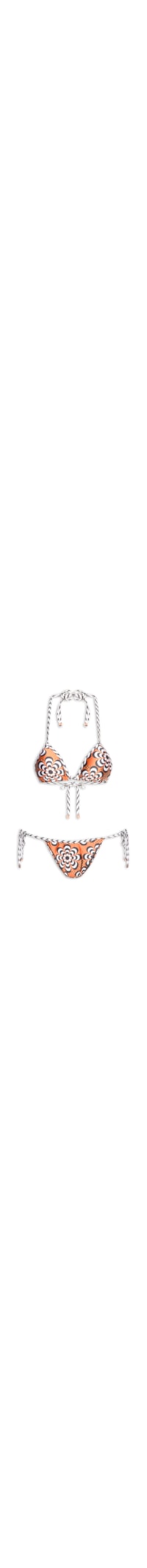 O biquíni marrom é confeccionado em malha de poliamida com elastano de alta elasticidade. O top cortininha com decote em V, alças finas ajustáveis por amarração no pescoço e nas costas, estampa geométrica contrastante. A calcinha modelo cortininha com laterais ajustáveis por amarração, acabamento embutido e ponteiras decorativas aplicadas nas extremidades.
