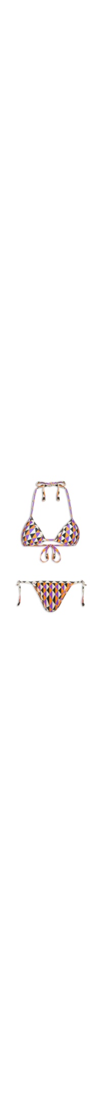 O biquíni laranja é confeccionado em malha leve de média elasticidade. O top de modelo cortininha, possui alças finas estendidas para amarração posterior, bojo removível, estampa geométrica em cores contrastantes, forro e fechamento posterior por amarração. A calcinha de modelo string, possui cintura baixa, laterais finas, estampa geométrica em cores contrastantes e fechamento nas laterais por amarração.