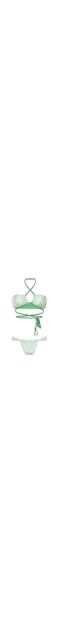O biquíni verde é confeccionado em malha de poliamida com alta elasticidade. O top de modelo cortininha invertida possui decote halter, alças finas com acabamento trançado e miçangas aplicadas, estampa floral na cor off white, bojo removível, alças finas com acabamento trançado aplicadas na parte frontal e forro. A calcinha de modelo cortininha possui laterais finas, com tiras com acabamento torcido aplicadas e forro.