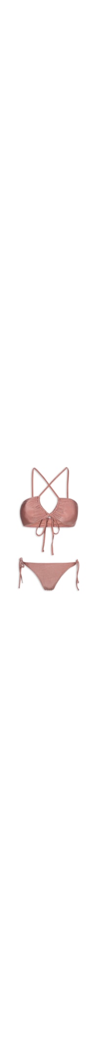 O biquíni rosa é confeccionado em malha cirrê de média elasticidade. O top de modelo cortininha invertida, possui decote halter, alças finas estendidas para amarração posterior, bojo removível e forro. A calcinha de modelo string, possui cintura baixa, laterais finas, costura ripple na parte posterior com tag metalizada da marca aplicada, forro e fechamento nas laterais por amarração.