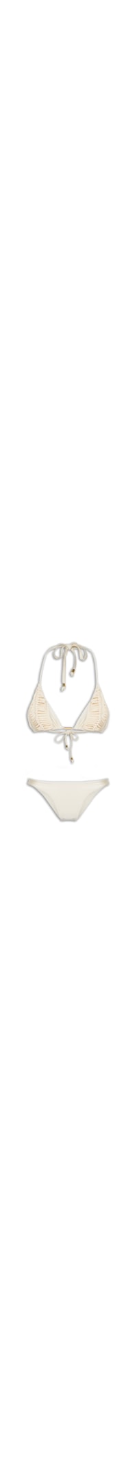 O biquíni off white é confeccionado em malha de poliamida com média elasticidade. O top de modelo cortininha, possui alças finas com regulagem, macramê aplicado no busto, detalhe de aviamento metalizado na parte frontal, fechamento posterior por amarração, bojo removível e forro. A calcinha de modelo tanga, possui cintura baixa, laterais médias e forro.