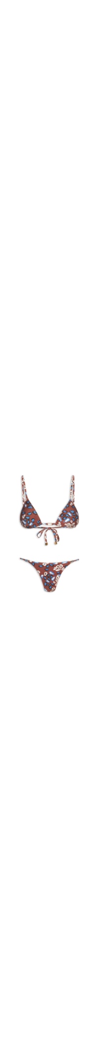 O biquíni animal print é confeccionado em malha de poliamida com média elasticidade. O top de modelo cortininha possui alças finas reguláveis, estampa animal print em cores contrastantes, forro, bojo removível e tiras estendidas para fechamento posterior por amarração. A calcinha de modelo tanga possui cintura baixa, laterais finas reguláveis, estampa animal print em cores contrastantes e forro frontal.