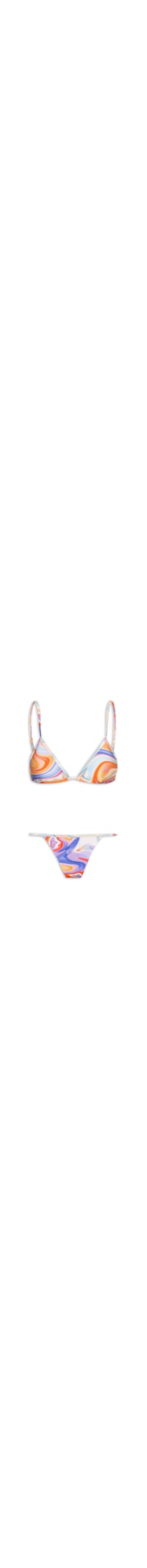 O biquíni laranja é confeccionado em malha de poliamida com alta elasticidade. O top de modelo cortininha possui alças finas reguláveis, forro, bojo removível e padronagem tie dye em cores contrastantes. A calcinha possui cintura baixa, laterais finas, forro e padronagem tie dye em cores contrastantes.