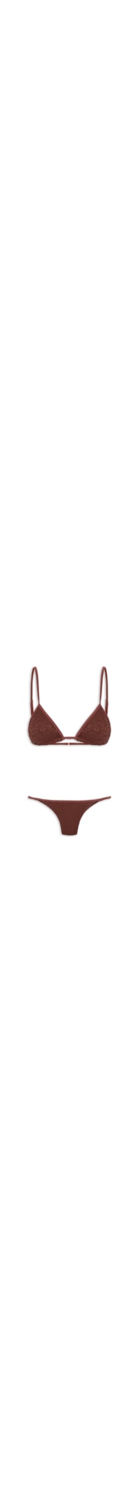 O biquíni marrom é confeccionado em malha leve com superfície texturizada e alta elasticidade. O top de modelo cortininha possui alças finas, forro, bojo removível, laterais finas e regulagem posterior. A calcinha de modelo string possui laterais finas reguláveis recorte posterior e forro.