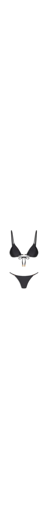 O biquíni preto é confeccionado em malha de poliamida com baixa elasticidade. O top de modelo cortininha possui alças finas reguláveis, laterais finas, detalhe em aviamento metalizado na parte frontal, bojo removível e fechamento posterior por amarração A calcinha possui cintura baixa, laterais finas reguláveis com detalhe em aviamento metalizado na parte frontal, parte posterior fio dental e forro.