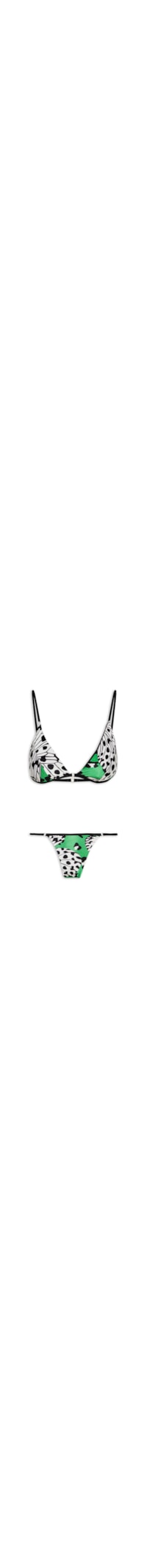 O biquíni verde é confeccionado malha de poliamida com alta elasticidade. O top justo ao corpo possui decote v, alças finas com ajuste, argola frontal metalizada, estampa abstrata em cor contrastante, tira inferior ajustável, bojo embutido removível e forro. A calcinha justa ao corpo possui alças laterais finas com argolas metalizadas aplicadas, estampas abstratas em cores contrastantes e forro.