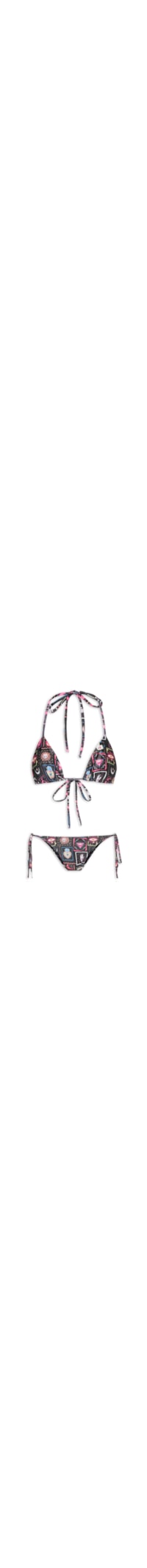 O biquíni preto é confeccionado em malha leve com alta elasticidade. O top de modelo cortininha possui decote V, alças em tiras finas estendidas para amarração posterior, mix de estampas em cores contrastantes, forro e fechamento posterior por amarração. A calcinha de modelo string possui laterais em tiras finas estendidas para amarração, mix de estampa em cores contrastantes e forro.