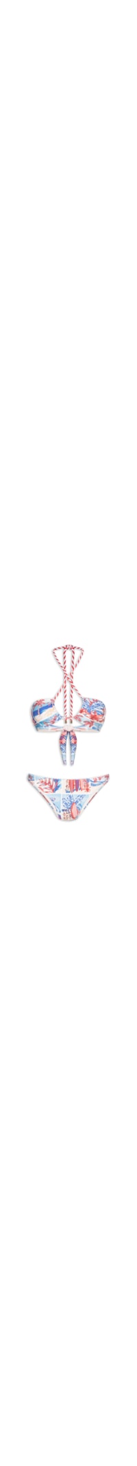 O bíquini branco é confeccionado em malha de poliamida com alta elasticidade. O top possui decote em V, alças finas com efeito torcido, forro, mix de estampas em cores contrastantes e amarrações na parte posterior. A calcinha possui cintura baixa, tiras laterais médias, forro e mix de estampas contrastantes.