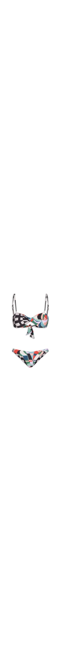 O biquíni azul é confeccionado em malha com alta elasticidade. O top de modelo meia taça possui alças finas removíveis, mix de estampas em cores contrastantes, sem bojo, recortes frontais, dupla face, detalhe de torção na parte frontal e fechamento posterior por amarração. A calcinha de modelo tanga possui cintura baixa, lateral médias, mix de estampas em cores contrastantes e dupla face.